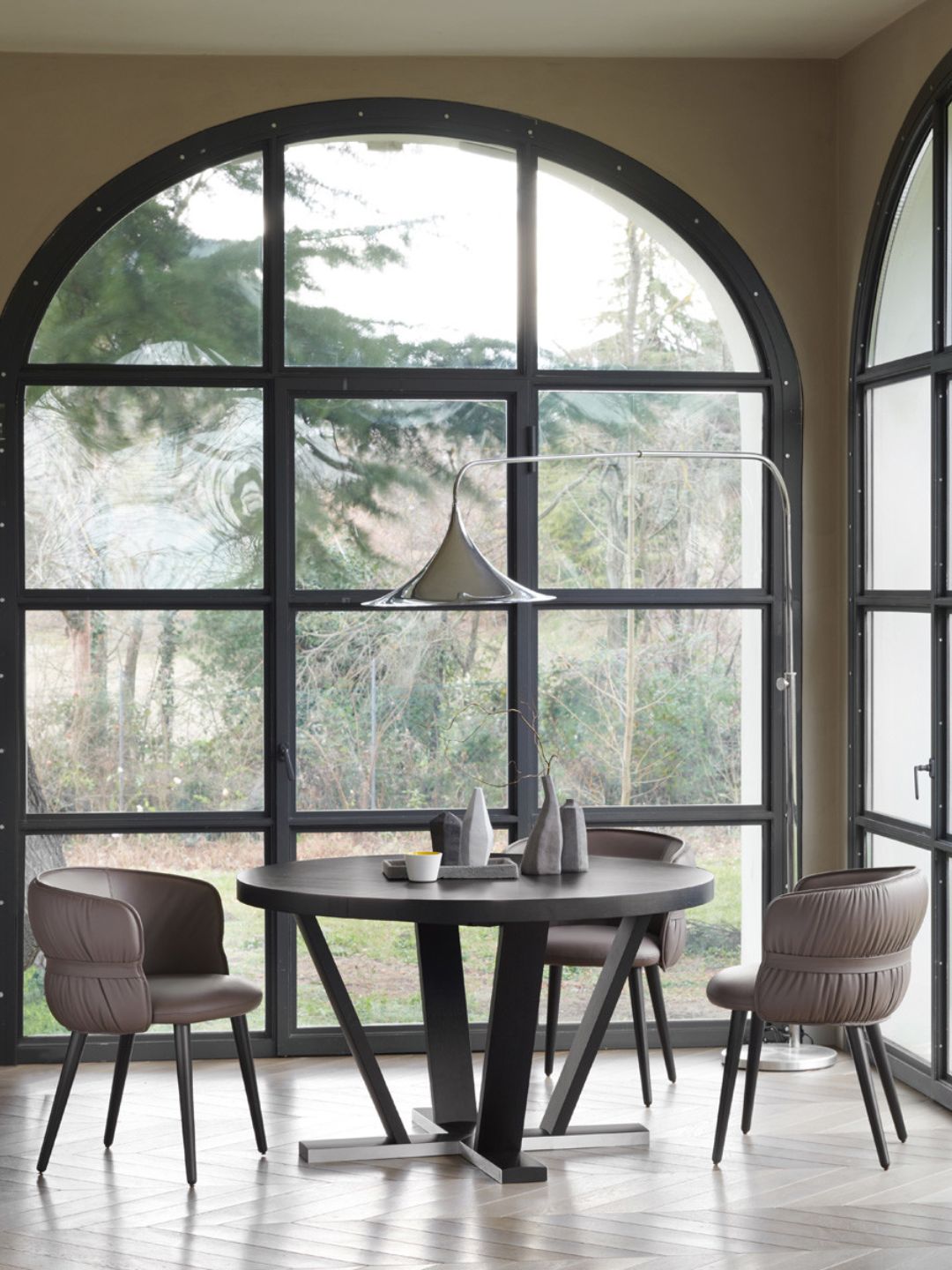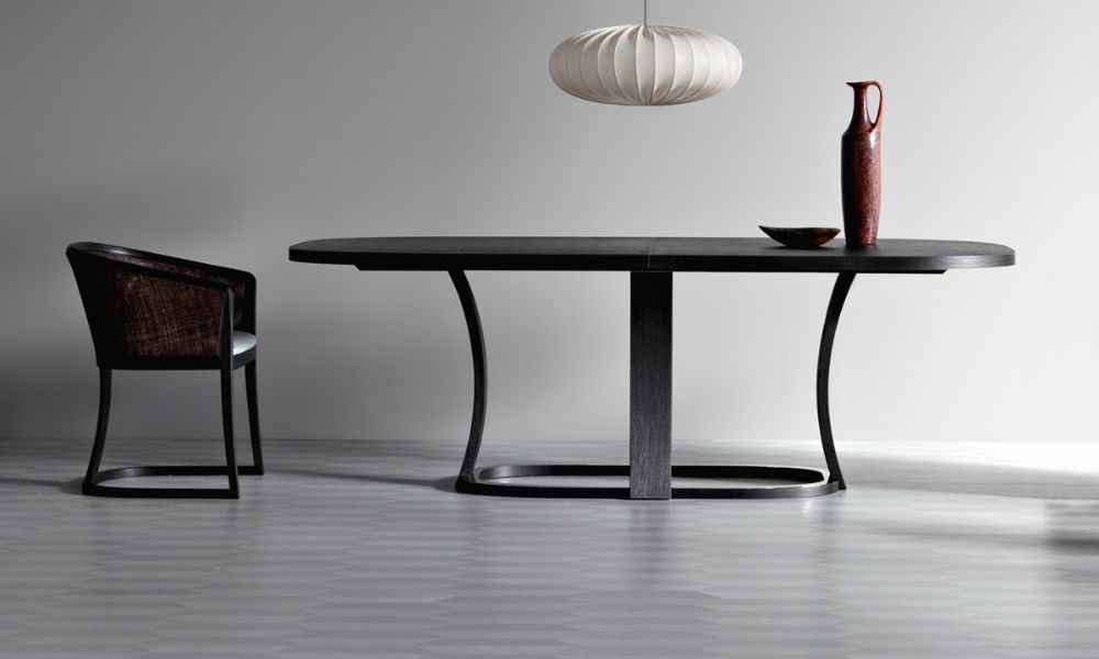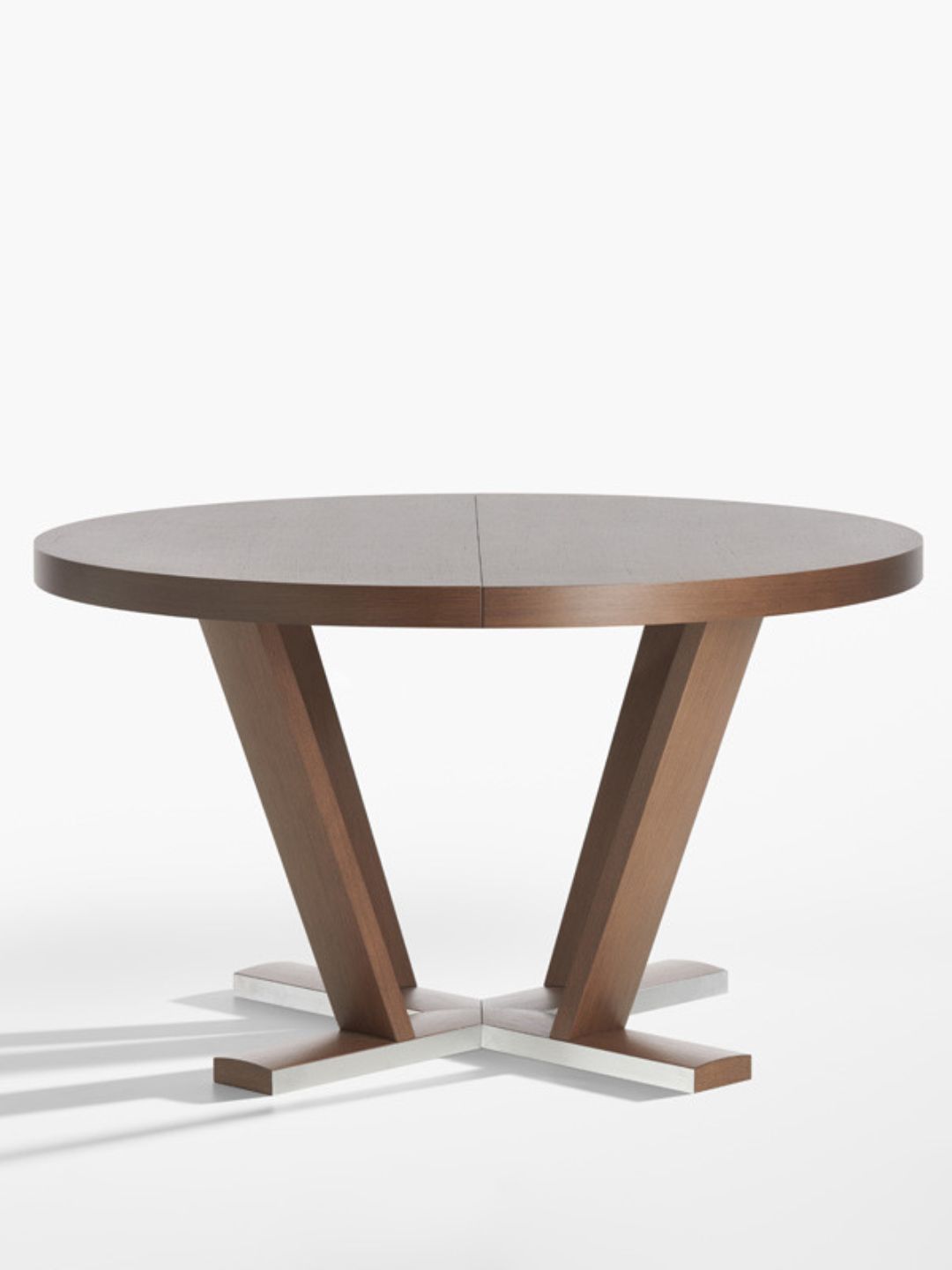 The Aura extendable table develops from a cross shape oak base, which is its distinctive element, combined with an essential extendable circular top in the same wood essence, giving it a simple yet incisive look.