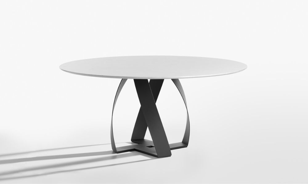 The design with intertwined bands of the metal base is the element that characterizes the Bon Bon tables and coffee tables’ family.