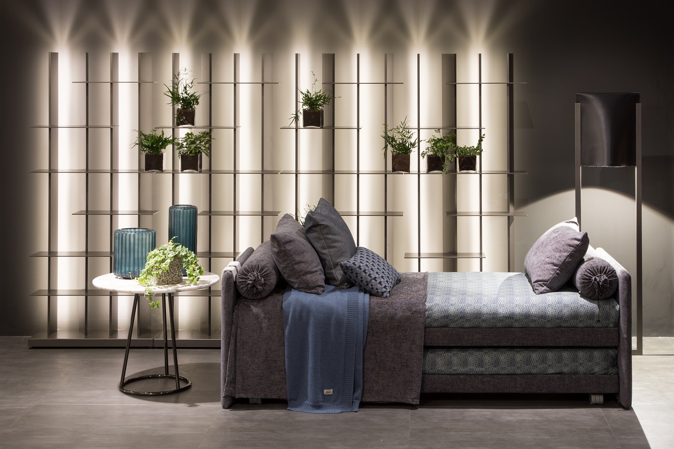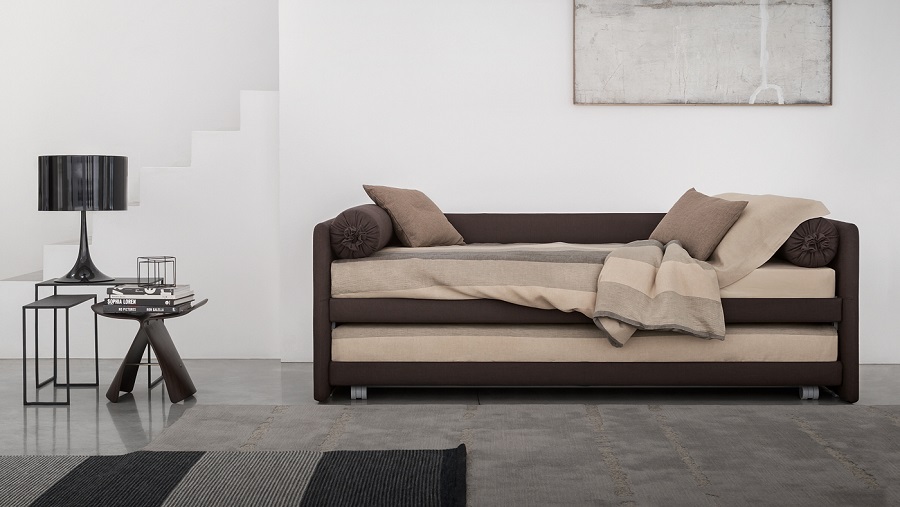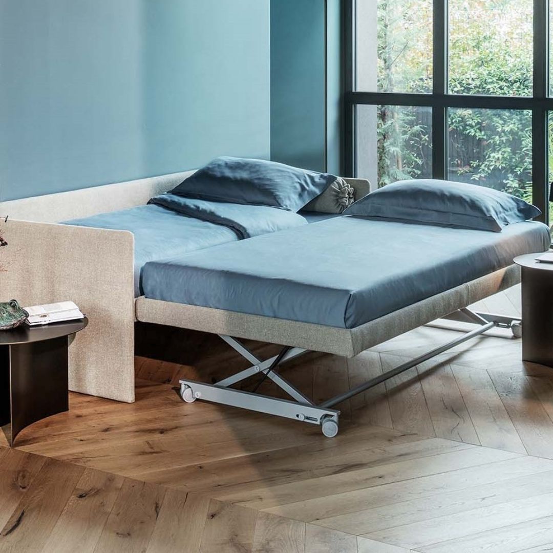 It is a convertible bed with a simple and elegant design. The modularity of the system allows to be easily transformed to perform different functions. Duetto offers different solutions in a single product proposal: sofa bed, single bed, double bed, two independent single beds. From a single bed, Duetto easily becomes a double bed with the addition of a second pull-out bed, which lifts to the same height as the first bed thanks to a practical gas-piston mechanism. The second bed is anchored to the first with two steel and rubber blocks