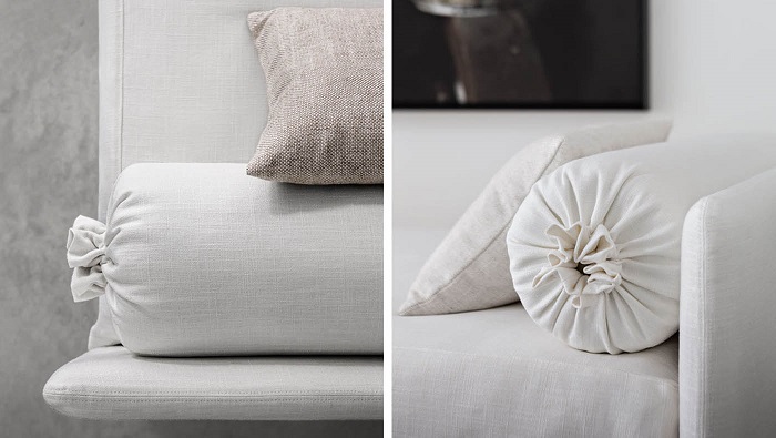 Complemented by an elegant upholstered headboard, zipped cushion bags and roll cushions, it can be customised with an upholstered backrest or two comfortable and spacious fabric drawers on wheels - as an alternative to a second bed.