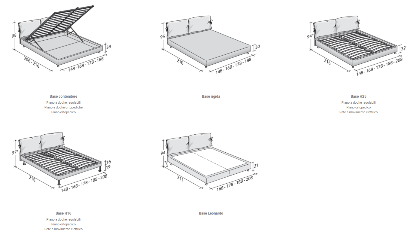 Available with rigid base, base Leonardo, storage base, base H.25 cm. or H.16 cm. and electrical powered adjustable slats.