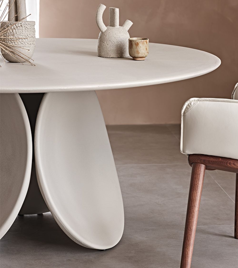 The base of this modern table is finished in clay, with earthy and natural shades.
