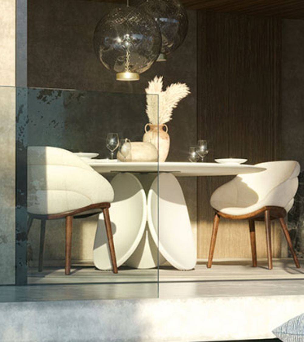 The design of the Maxim table-sculpture stems from the seamless link between its shape, consisting of three petals, and the material it is made from. Just as a sculpture emerges from the material in the hands of the master, likewise by looking at this round design table you can perceive the effort and time taken by man to shape it.