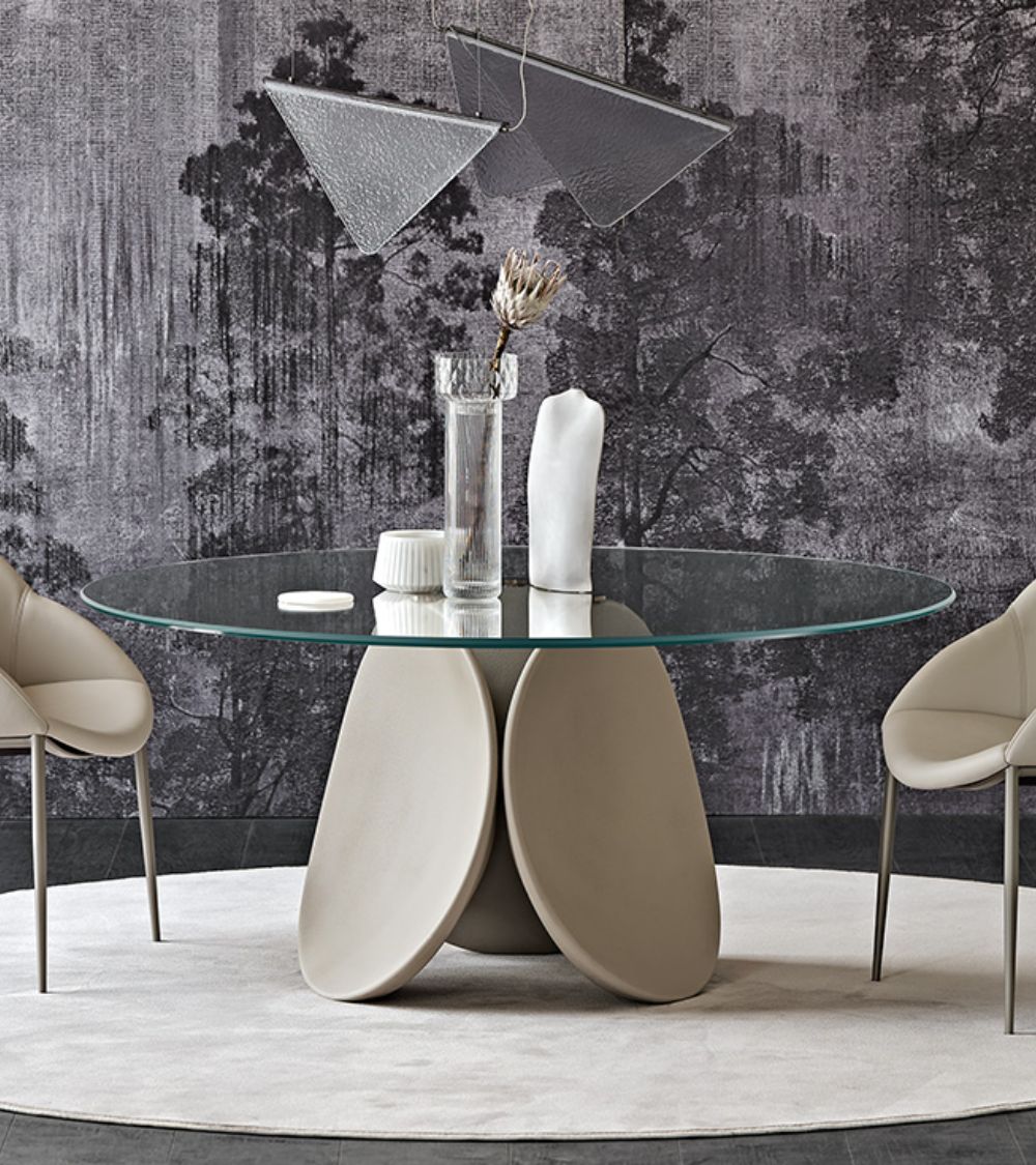 Maxim comes in two versions: a round table with a transparent glass top that lets you appreciate the sculptural base in its entirety, and the Maxim Argile model completely spatulated in clay, lending it an even more organic look.