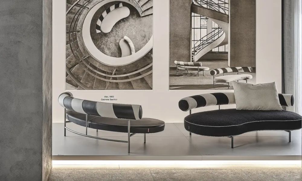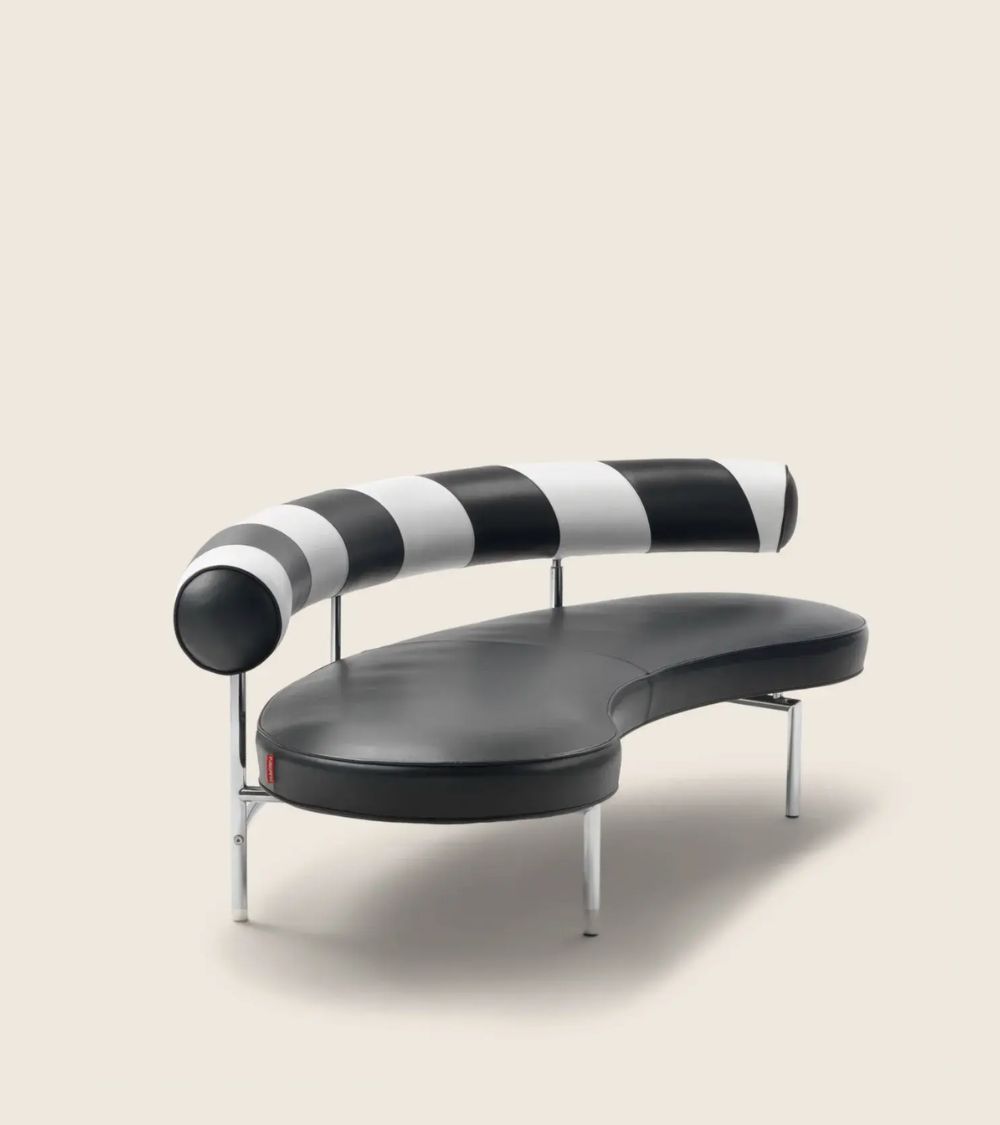 The Max sofa can be upholstered in leather or fabric. A trendy version was crafted with unique black and white optical-print leather upholstery and entered the collective imagination.